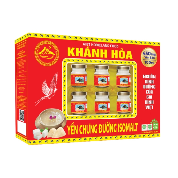 Thành phần: Nước, yến sào (0,45 g/100 ml), chất tạo ngọt tổng hợp (INS 953, INS 955), chất ổn định (INS 401, INS 415, INS 407), chất làm rắn chắc (INS 327), chất làm dày (INS 418), hương liệu giống tự nhiên